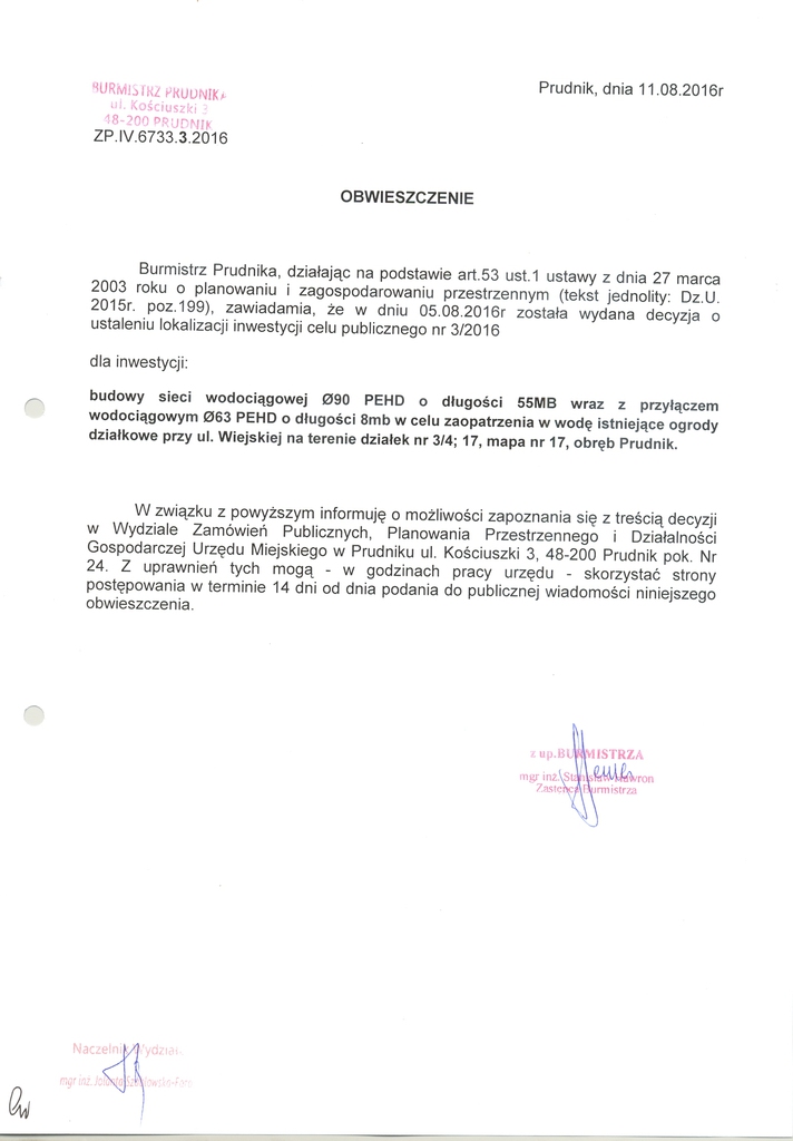 Decyzja Burmistrza Prudnika Nr 3/2016 o ustaleniu lokalizacji inwestycji celu publicznego z dnia 05.08.2016r